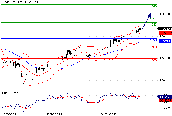 Our Preference: LONG positions above 1590 with 1613 & 1621 as next targets.